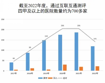 随着医院数智化建设不断深入,越来越多的医院通过了互联互通测评,不少医院更是获评了五级乙等。数据显示,截至2023年度,已有700余家医院通过了互联互通四级甲等测评,通过五级乙等测评的医疗机构也有近100家。