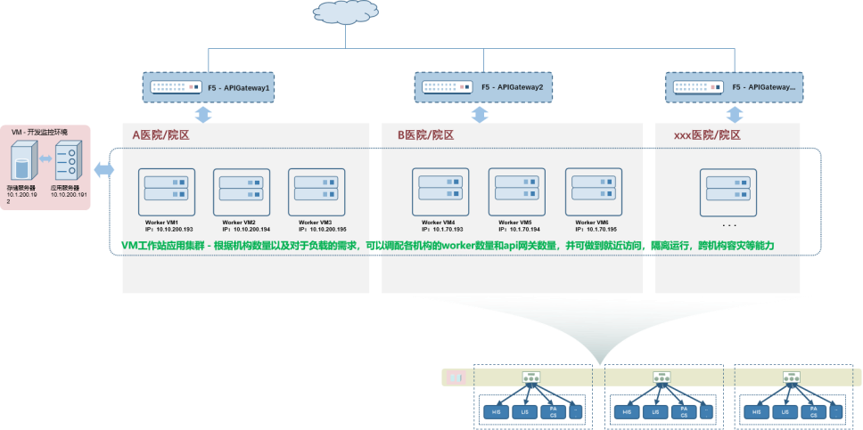 此类场景一般是用于集团化多院区有多个数据中心,或者区域有多家医疗机构需要进行集成业务的统一规划监管,同时对负载和容灾有较高要求时,采用此类多域多机构的部署方案。