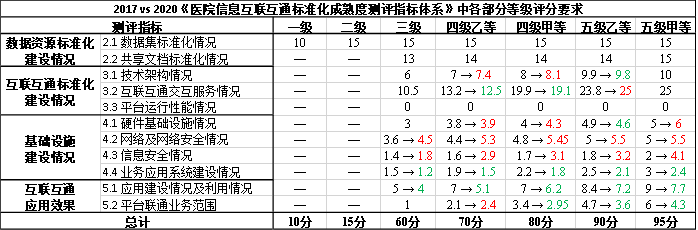 将2017年和2020年的评分指标横向进行比较(见表1),从四甲开始,网络及网络安全情况、信息安全情况这两部分的分值较2017版均有所提升,而业务应用系统建设、应用建设及利用情况和平台联通业务范围的分值则有所下降。 同时值得注意的是,由于平台运行性能不计分,2020版的互联互通测评标准满分就是95分,所以五级甲等95分的评分要求也意味着医院需要100%达到测评指标中的每一项要求。