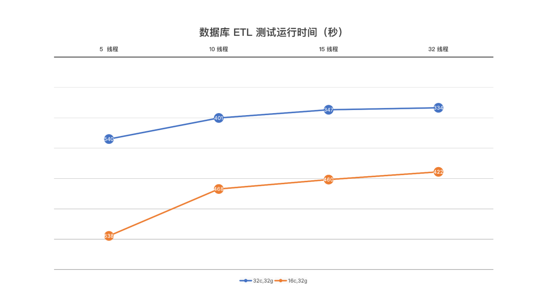针对医院不同的规模,分别对两组硬件(高、低配)执行上述测试。 结果显示,采用高配置(32 线程)下,只需大约 5 分钟就可完成包含 3,000,000 条数据的 ETL 过程。