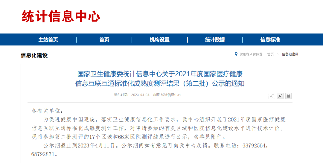 近日,国家卫生健康委统计信息中心发布《2021年度国家医疗健康信息互联互通标准化成熟度测评结果(第二批)公示名单》,共有17个区域、66家医院参加了第二批测评。